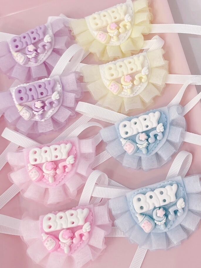 ふわふわのチュールフリルとBABYモチーフ、哺乳瓶や魔法のステッキを組み合わせた、やさしい色味のデザインに仕上げました。